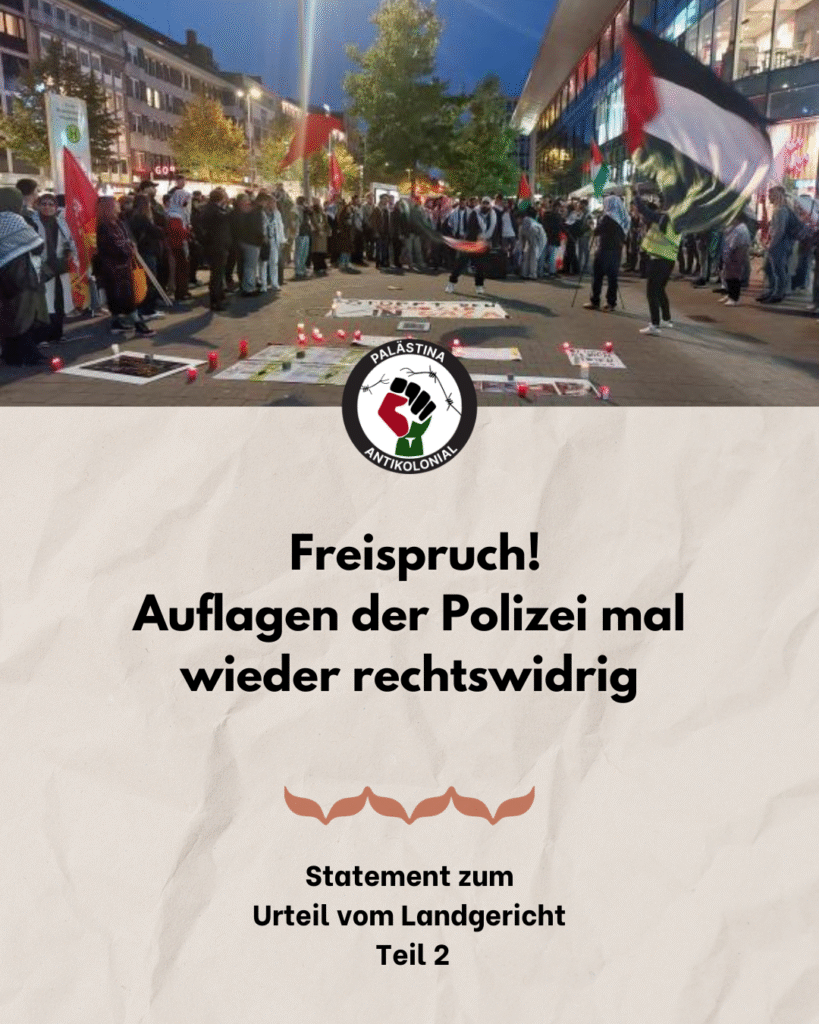 Nachdem wir geklagt haben, haben sich nahezu alle Auflagen der Polizei, mit denen sie uns seit Oktober 2023 schikanieren, als rechtswidrig erwiesen. Sie wollten uns zwingen, ihre absurden Auflagen vorzulesen. Das war rechtswidrig. Sie wollten uns zwingen, alle möglichen verbotenen Organisationen aufzuzählen, deren Symbole nicht gezeigt werden dürfen, als hätten wir irgendeine Nähe zu diesen. Das war rechtswidrig. Sie wollten uns zwingen, der deutschen Staatsräson zu gehorchen, die von einem erfundenen „Existenzrecht“ schwafelt. Das war rechtswidrig. Sie wollten uns verbieten, Freiheit für ganz Palästina einzufordern. Das war rechtswidrig.
